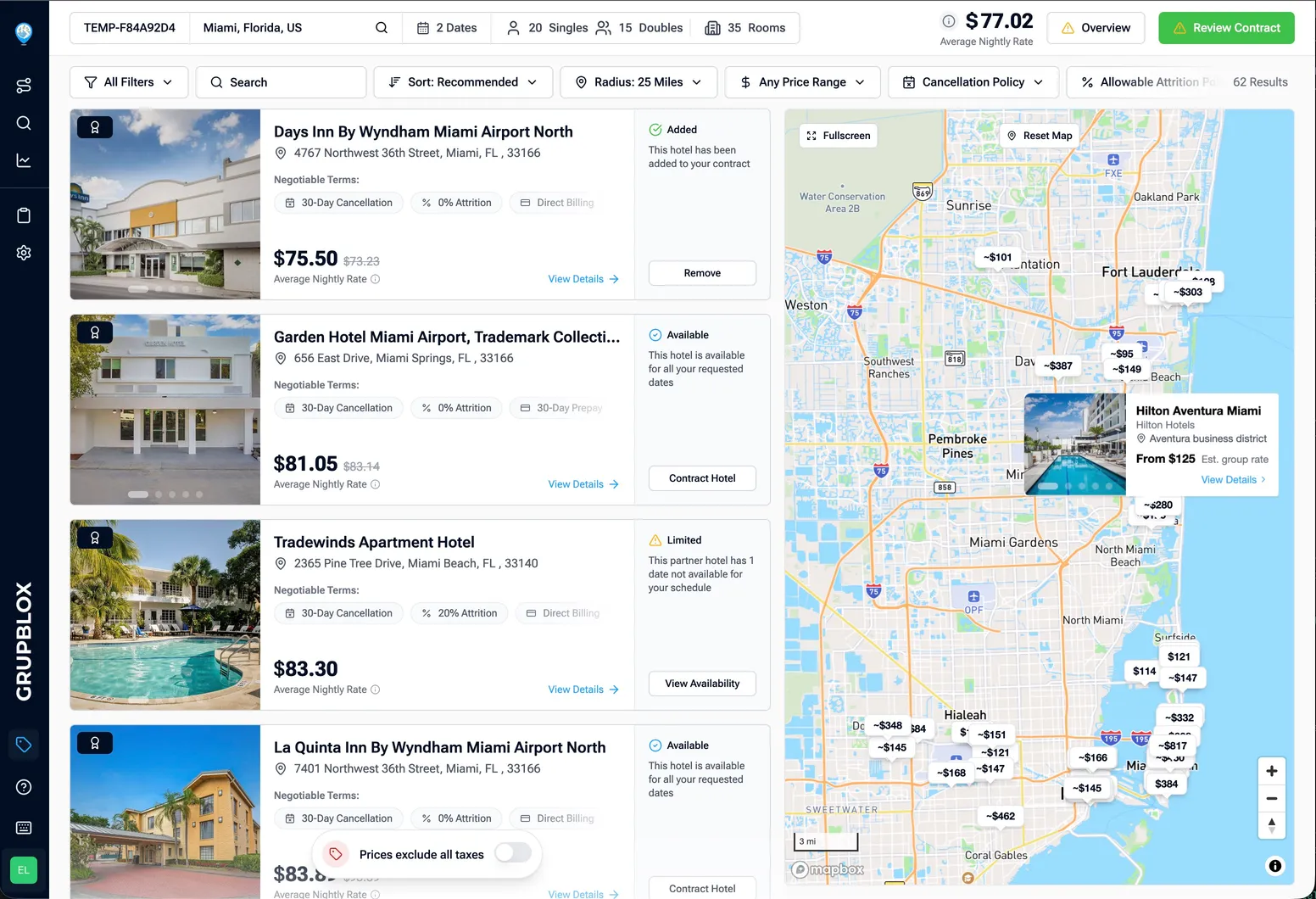GrupBlox provides real-time availability updates, instant contract generation, and seamless communication. You can import spreadsheets, set budgets and room allocations, search hotels with intelligent filtering, and contract group blocks in minutes instead of weeks.